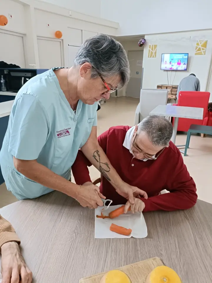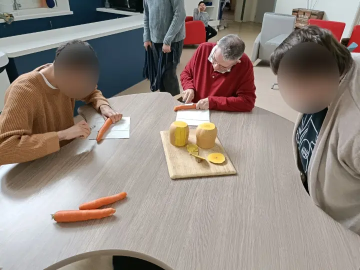 Éplucher, couper, mélanger, sentir… Chaque étape a été l’occasion pour les résidants de participer activement à la réalisation de cette recette simple mais savoureuse. Un moment riche en échanges et en sourires, où chacun a pu mettre la main à la pâte et partager ses impressions.