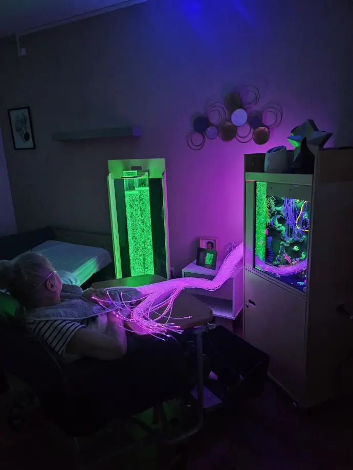 À la MAS , nous avons à cœur de rendre accessibles à tous nos résidants les bienfaits des approches sensorielles, quel que soit leur niveau de mobilité. Les séances Snoezelen peuvent être organisées directement dans la chambre des résidants, grâce à notre matériel mobile dédié.
